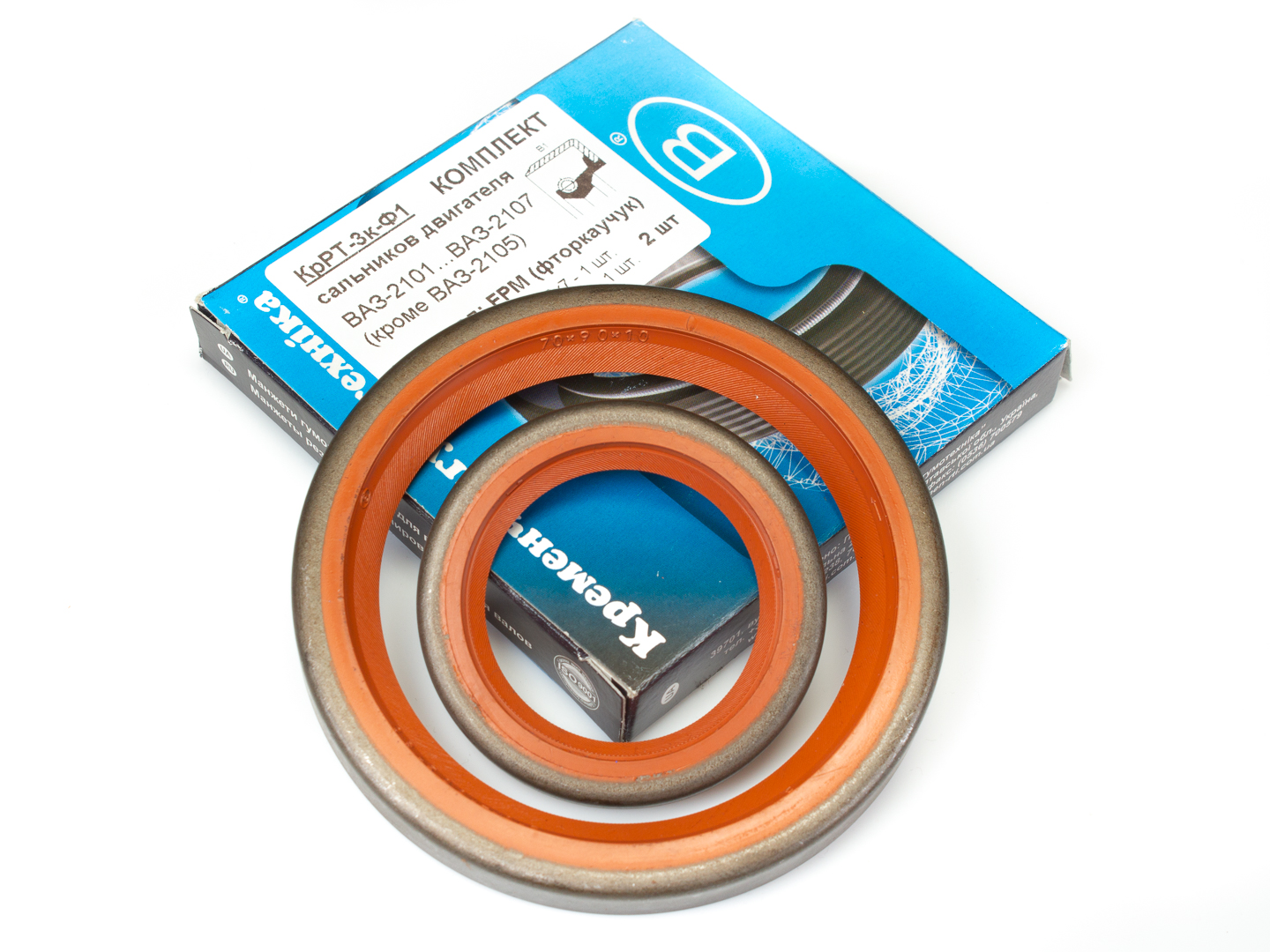 SERIES-F1. Fluororubber FPM, with open frame (metal), without anther. The estimated resource is 175,000 km. The set includes: 2101-1005034 Front crankshaft oil seal 40x56x7 and 2101-1005160 Rear crankshaft oil seal 70x90x10 VAZ 2101, 2102, 2103, 2104, 2105, 2106, 2107.
